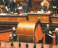 El centroizquierda italiano tuvo un día con sabor amargo en la primera sesión del Parlamento celebrada ayer. Los dos candidatos de La Unión, dirigida por Romano Prodi, para presidir la Cámara de Diputados y el Senado no obtuvieron la mayoría necesaria en las tres primeras vueltas, por lo que la batalla por la dirección del Parlamento se decidirá hoy en nuevas votaciones. Luego de abrir las sesiones con minutos de silencio en recuerdo de los tres militares muertos esta semana en un atentado en Irak, los diputados y senadores elegidos en los comicios –en los que la alianza de Prodi se impuso a la del aún primer ministro, Silvio Berlusconi– tuvieron la tarea de votar a los presidentes de sus respectivas cámaras, pero a última hora de la jornada no se había llegado a un acuerdo.