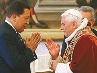 El presidente de Venezuela, Hugo Chávez, estuvo reunido ayer durante 35 minutos con el papa Benedicto XVI (foto) en la ciudad del Vaticano. Durante el encuentro, que en principio debía durar tan solo 10 minutos, el mandatario venezolano conversó sobre los temas de mayor preocupación para la Iglesia en Venezuela, como son la pobreza y la inseguridad. Se trata de la primera vez que el pontífice alemán recibe al presidente Chávez, quien ha tenido relaciones tensas con las jerarquías vaticanas en sus siete años de gobierno. Durante el encuentro, el pontífice ilustró los asuntos que considera más importantes, entre ellos la defensa de “la libertad de la Santa Sede para nombrar obispos”, así como “el proyecto de reforma de la enseñanza que excluye la religión de los programas”. Chávez también llamó por teléfono al líder de la coalición de centroizquierda italiana, Romano Prodi, para felicitarlo por el triunfo logrado en las elecciones del pasado 9 y 10 de abril. Prodi, por su parte, subrayó el “profundo” interés de Italia en mantener una relación constructiva y de colaboración más intensa con Latinoamérica.
