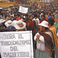 Choferes sindicalizados, maestros urbanos y trabajadores de la Caja Nacional de Salud coincidieron en un paro de 48 horas, con ruidosas movilizaciones callejeras, para hacer oír sus demandas. Los maestros piden la renuncia del ministro de Educación, Félix Patzi, la realización de un nuevo congreso educativo y la satisfacción de un pliego de demandas gremiales. Los transportistas rechazan los montos de las multas de tránsito, la escasez de combustible y los requisitos para obtener la “tercera placa” (un sticker con código de barra con los datos del vehículo). Y el sindicato de la Caja reclama por el despido de dirigentes sindicales acusados de corrupción, en el marco de la intervención de esa entidad.