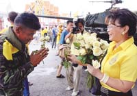 Pero otros hablaban a favor del premier depuesto. “Nos gusta Thaksin. Hizo mucho por nuestro país –dijo Nog, una joven mujer que regresaba a su hogar después de un día de trabajo en los negocios de moda de la Plaza Siam–. Nos llevó de ser un país pequeño, no importante, a ser uno grande.” “Tenemos un poco de miedo ahora –dijo su amiga Praew–. Lo que está haciendo el general Sondhi está mal. No tenemos libertad.” Muchos de los que hablaban en favor de Thaksin tenían miedo de dar sus nombres completos, una señal del temor que existe bajo la superficie aquí. Muchos dijeron que eran partidarios de Thaksin, pero que la relación entre él y los manifestantes era tan mala que el golpe era la única salida para el país. “Antes que salga el sol, hay que soportar la lluvia”, fue como lo dijo un hombre.