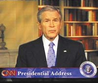 ¿Viste cómo lo presentó? Espectacular. Corbata celeste, tranqui, nada de rojo para irritar. Nada de bandera, nada de Salón Oval. Dio el discurso en la biblioteca de la Casa Blanca, con libros con lomo de cuero como telón de fondo, después de la hora de cenar. Luz tenue, clima intimista, frases simples, veinte minutos por reloj. Como si fueran dos viejos amigos, Bush y el televidente, se encerraran en un escritorio cuando lo chicos se van a dormir, para hablar tranquilos de un tema que preocupa. Antes, Bush había convocado a la Casa Blanca a los 20 presentadores de noticias más importantes de la televisión, para anticiparles, con un slide show-Power Point, el contenido de su mensaje. Imaginate al presi reunido con Santo, María Laura, Cristina, Guillermo y todos los demás antes de un discurso importante. ¡Genial!