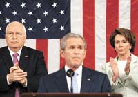 Las miradas de los norteamericanos se concentraron en los compañeros de pantalla de Bush y en la escenografía del pomposamente llamado Discurso del Estado de la Unión. Las cámaras enfocan al presidente y a las dos personas sentadas detrás de él, con la bandera como telón de fondo. Esas personas son el presidente del Senado, en este caso el vicepresidente Dick Cheney, y la líder de la Cámara de Representantes, en este caso Nancy Pelosi, la jefa de la oposición. Ver la cara de la líder opositora mientras escucha las palabras de su principal adversario político tiene su gracia. Pelosi, explicó el New York Times, había sido entrenada horas antes del discurso para evitar cualquier mueca, media sonrisa, resoplido o desvío de la mirada que pudiera marcar, ante millones de televidentes, una toma de posición del Partido Demócrata ante alguna iniciativa del presidente.