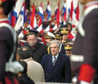 No es la primera vez que el presidente Vázquez convoca a una movilización en la Plaza de la Independencia. Ya lo había hecho en marzo de 2006, para festejar su primer año en el gobierno. En aquella ocasión, la plaza y las calles aledañas rebosaban de dirigentes, militantes y simples ciudadanos que, en medio de un clima festivo, le daban su apoyo al primer gobierno de izquierda de la joven democracia uruguaya. La escena de ayer era muy distinta. Ya no eran 20 mil las personas que aplaudían a Vázquez, sino unas tres mil o cuatro mil, en su gran mayoría dirigentes políticos, incluyendo algunos miembros de la oposición, como el presidente de los blancos, Jorge Larrañaga, y Pedro Bordaberry, hijo del dictador.