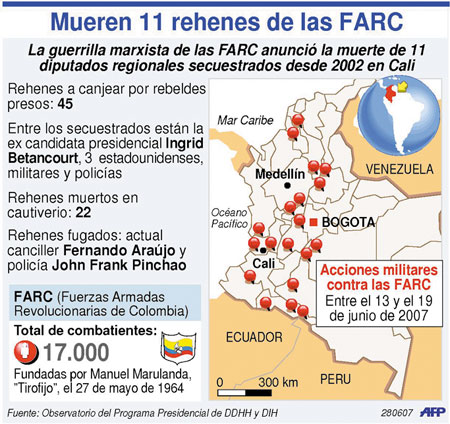 El grupo rebelde anunció que once de doce ex diputados en cautiverio fueron muertos por fuego cruzado con los militares. El presidente Uribe, quien había ordenado rescates por la fuerza, rechazó la versión y habló de “premeditación criminal”.