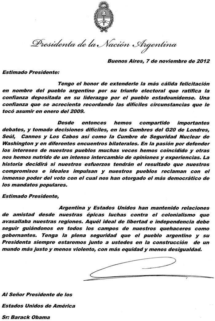 En la carta, CFK le prometió al presidente de Estados Unidos que “el pueblo argentino y su Presidenta siempre estarán junto a ustedes en la construcción de un mundo más justo y menos violento, con más equidad y menos desigualdad” y destacó que el triunfo del candidato demócrata “ratifica la confianza depositada en su liderazgo por el pueblo estadounidense, una confianza que se acrecienta recordando las difíciles circunstancias que le tocó asumir en enero de 2009”, en referencia a la crisis económica que ese año estalló en ese país y luego se contagió a Europa, donde aún no remite.