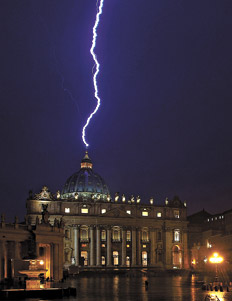 La imagen del rayo que cayó sobre la cúpula de la Basílica de San Pedro del Vaticano horas después de que el papa Benedicto XVI anunciara su renuncia al Pontificado dio la vuelta al mundo, convirtiéndose en una de las fotografías más publicadas ayer por la prensa. La captura, obra del fotógrafo Alessandro di Meo, generó todo tipo de especulaciones y comentarios en las redes sociales: algunos usuarios mencionaron la posibilidad de que el rayo sea fruto de algún tipo de designio divino, tras la primera renuncia de un jefe de la Iglesia Católica ocurrida en los últimos siglos. En la imagen se puede ver claramente cómo el rayo, que ilumina el cielo de la noche en Roma, cae sobre la punta de la cúpula de la basílica vaticana. El fenómeno se produjo luego de que el propio decano del colegio cardenalicio, Angelo Sodano, hiciera pública la primera reacción oficial en la Iglesia Católica tras conocer la noticia. “Ha sido como un rayo caído a cielo abierto”, dijo Sodano. Después de una mañana nublada y con lluvias intermitentes, el cielo terminó de cerrarse por la tarde para dar paso a una tormenta.