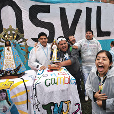 En la entrada había una bandera de saludo de los curas villeros de Argentina, algunos de ellos en Río de Janeiro, como el padre Hernán, al frente de un grupo de chicos de la 1-11-14. Francisco se colocó la guirnalda de flores de bienvenida y estuvo en la humilde capilla San Jerónimo, aún con su altar a medio terminar, donde recibió un cáliz de regalo. A la salida abrazó a un grupo de chicos que lo esperaban y saludó a la gente. Uno se tomó el trabajo de conseguir una bandera de San Lorenzo, con la que el Papa posó feliz. Estuvo en la casa de Manuel, uno de los vecinos preseleccionados para ser visitados. Luego dio un discurso en la canchita de fútbol comunitaria. Dijo que hubiera querido estar en la casa de cada uno de ellos, “tomar un vaso de agua, un cafezinho, pero no una cachaça”. El chiste enloqueció a los brasileños, la frase la repetían en todas las radios. “Nunca escuché a un papa hablar así”, decía luego el conductor de uno de los programas más populares.