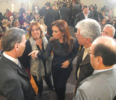 Los legisladores que asistieron a Olivos sumaron más de 140. Habían sido invitados los 129 diputados y 36 senadores que votaron a favor del proyecto de retenciones móviles; algunos estaban de regreso en sus provincias y avisaron que no podrían estar presentes. La Presidenta los recibió acompañada por el secretario legal y técnico, Carlos Zannini; el ministro del Interior, Florencio Randazzo; el secretario general de la Presidencia, Oscar Parrilli, y el jefe de Gabinete, Alberto Fernández. La reunión comenzó luego de que CFK se ubicara en la cabecera del auditorio, donde también se sentaron los jefes de bloques Miguel Pichetto y Agustín Rossi y el presidente provisional del Senado, José Pampuro. Ex ministro de Defensa, secretario general de la Presidencia durante el mandato provisional de Eduardo Duhalde, Pampuro fue uno de los actores clave en el conflicto con Cobos. “Con el senador Pampuro tengo una excelente relación”, lo elogió el vicepresidente en su viaje triunfal a Mendoza.