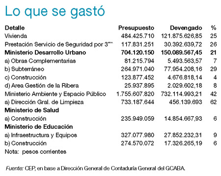A pesar de los múltiples reclamos de los alumnos porteños por falta de gas y por el mal estado edilicio de las instituciones educativas, en los primeros seis meses de 2008 Mauricio Macri sólo ejecutó el 6 por ciento del presupuesto que estaba asignado a construcción de escuelas y el 9 por ciento del de reparaciones y equipos. Lo mismo ocurrió con la construcción de hospitales y centros de salud, rubro en los que la ejecución del primer semestre tampoco superó el 6 por ciento. Para los hogares de día, donde paran los chicos de la calle, el gobierno de la ciudad sólo gastó el 7 por ciento del presupuesto que le aprobó la Legislatura. En Emergencia Habitacional, Promoción Social y Hábitat, Macri gastó el 2 por ciento del dinero con el que cuenta. En deporte comunitario aún no gastó un peso.