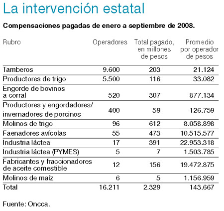 Las transferencias a los tambos de Biolcati forman parte de una política general que se aplica desde marzo de 2007. En el año y medio transcurrido desde entonces, el Estado pagó compensaciones por casi 3500 millones de pesos. Entre enero y setiembre de 2008 se pagaron 2329 millones y el presupuesto enviado al Congreso contempla una partida de 3900 millones en 2009. Para aspirar a las compensaciones es necesario inscribirse en la Oncca. Los requisitos son simples para quienes trabajen dentro de la ley, con declaraciones juradas exactas y pago oportuno de las obligaciones fiscales. Quienes ya han realizado ese trámite son dieciséis mil productores. Los tamberos son los más numerosos: 9600. También hay inscriptos 5500 productores de trigo, 520 empresarios que engordan ganado en corrales llamados feedlots, 400 productores, engordadores o invernadores de porcinos, 96 molinos de trigo, 55 faenadores de aves, 17 establecimientos de la gran industria láctea y cinco de la pequeña y mediana, doce fabricantes y fraccionadores de aceite comestible y seis molinos de harina de maíz. El cuadro 2 contiene el detalle de los operadores y los pagos que reciben.