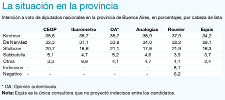 La mayoría de las encuestas otorga a la fórmula Néstor Kirchner-Daniel Scioli una ventaja que va de los cinco a los ocho puntos sobre el dúo Francisco de Narváez-Felipe Solá. En ese rango se ubican el CEOP, Analogías, Ibarómetro, Equis y Ricardo Rouvier. En un segundo margen de diferencia, dos conocidos consultores, Manuel Mora y Araujo y Hugo Haime, afirman que, hoy por hoy, tienen cuatro puntos de ventaja para el Frente para la Victoria (FPV). Del otro lado, hay dos estudios que tienen una visión diferente: uno de ellos adjudica una ventaja más leve al Frente para la Victoria y, por lo tanto, sostiene que existe un empate técnico; mientras que el trabajo que suele hacer Poliarquía para el diario La Nación, publicado el domingo pasado, afirma que De Narváez tiene una luz de 2,5 a su favor. El tercer lugar es para la fórmula del Acuerdo Cívico y Social, Margarita Stolbizer-Ricardo Alfonsín. Los sondeos le otorgan un porcentaje que está entre los 16 y los 22 puntos. Según sostienen el CEOP, Analogías, Ricardo Rouvier y Asociados, Equis e Ibarómetro, la distancia entre el Frente para la Victoria y Unión-PRO se fue ampliando en los últimos días, porque se consolidó el apoyo a Kirchner-Scioli en el Gran Buenos Aires y De Narváez no siguió creciendo.