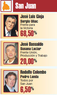 Tal como lo anunciaron las primarias, el gobernador sanjuanino, José Luis Gioja, obtuvo un amplio respaldo a su reelección. Los datos oficiales comenzaron a llegar pasadas las 21 y clavaron el redondeo de votos a su favor en cerca del 70 por ciento que logró en agosto pasado. El candidato por el Frente Unión, Producción y Trabajo –una alianza alineada a la candidatura presidencial del gobernador de San Luis, Alberto Rodríguez Saá–, Roberto Basualdo, obtuvo poco más del 19 por ciento. “Lo que viene es un mejor país, con la presencia de un Estado que promueve y con un Estado solidario, que es la base de todo este proyecto político que los argentinos han apoyado masivamente en la jornada democrática de hoy”, se despachó el mandatario reelecto.