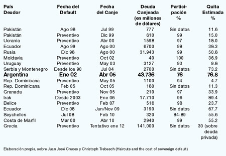 Estos datos son útiles para redimensionar la negociación que Kirchner condujo en 2005. El trabajo Haircuts and the cost of sovereign default, publicado hace dos semanas en el portal VoxEU.org, del Centre for Economic Policy Research (www.CEPR.org) estudia las reestructuraciones de deuda producidas en el mundo entre 1970 y 2010. Según sus autores, Juan José Cruces, decano de la Escuela de Negocios de la Universidad Torcuato Di Tella, y Christoph Trebesch, profesor de la Universidad de Munich, con 43.736 millones de dólares la reestructuración argentina fue la mayor de la última década y la quita, del 76,8 por ciento, sólo fue superada por la de Irak. Pero la deuda iraquí era casi tres veces menor que la argentina y fue condonada bajo la presión de las tropas estadounidenses ocupantes. Los países que declaran la moratoria de sus deudas “no parecen enfrentar serias penalidades en los mercados de crédito a mediano y largo plazo” y sus efectos en los costos del crédito son pequeños o poco duraderos. Los países que defaultean, a menudo tienen acceso a los mercados de capital “apenas un año después de la crisis”, lo que contradice “la teoría económica que sugiere un castigo en la reputación y la exclusión del mercado”, concluyen. A la luz de este análisis, es más notable que el crecimiento espectacular de la economía se haya realizado sin que el gobierno argentino recurriera a nuevo endeudamiento. Cuando lo haga, cuando las tasas que le ofrezcan sean atractivas, sólo será para financiar obras públicas. Recién ahora, con 141 mil millones de dólares Grecia pasará a encabezar el ranking en valor absoluto, aunque la quita que obtenga será inferior a la que consiguió Kirchner y a cambio de ella Atenas deba admitir una supervisión cotidiana de sus decisiones por parte del Fondo Monetario, el Banco Central Europeo y el Consejo de Europa, que harán añicos lo que queda de su soberanía nacional. Además, Grecia sólo reducirá su ratio de endeudamiento a 120 por ciento del PIB, mientras la Argentina lo hizo al 46,3 por ciento, de las cuales la mitad son deudas con el sector público nacional (ver cuadro 1).