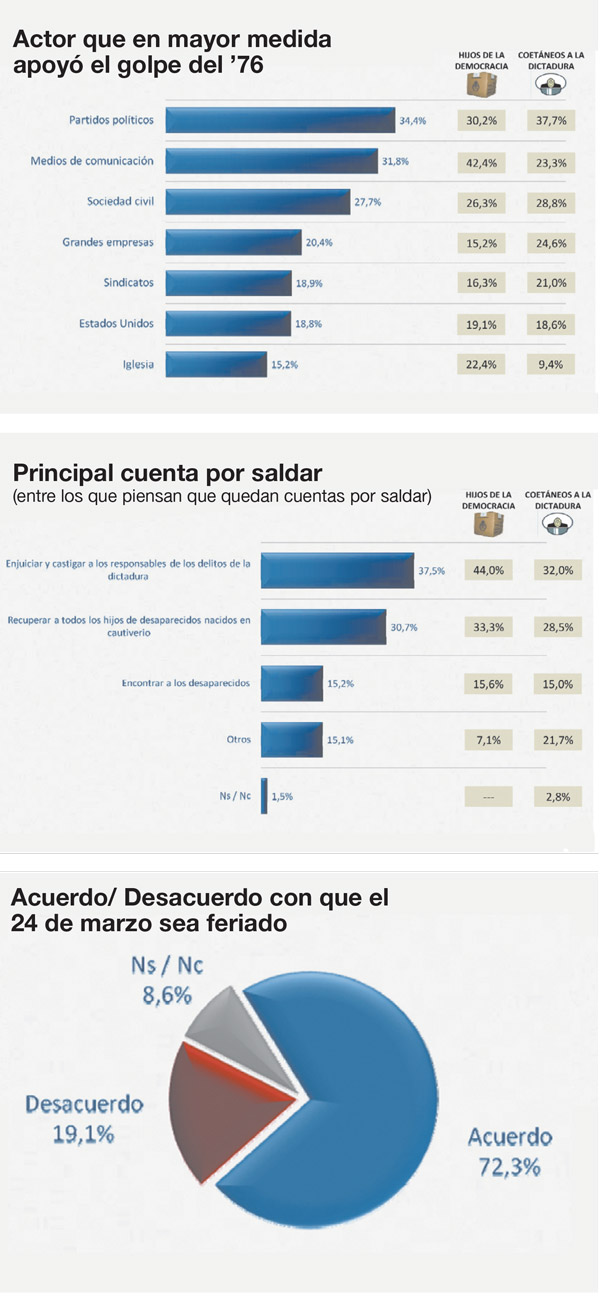 Aunque se trata de una evaluación histórica, cuando se les pregunta a los que fueron coetáneos de la dictadura que enumeren quiénes apoyaron el golpe, la mayor responsabilidad se pone en los partidos políticos, en segundo lugar en los ciudadanos comunes, en las grandes empresas y en los grandes medios. Pero la idea es que el golpe tuvo numerosos y variados apoyos. En cambio, para los hijos de la democracia, es decir los que nacieron después del Proceso, el orden cambia: los mayores culpables de haber apoyado el golpe son los medios de comunicación, porque justamente sienten hoy el poder que tienen los medios. Los hijos de la democracia han vivido de cerca el debate sobre la ley de medios y esto aflora incluso a la hora de evaluar el pasado. Recién después de los medios vienen, para los hijos de la democracia, los partidos y la Iglesia, a la que también ven con enorme poder, entre otras cosas por la traba al matrimonio igualitario o al aborto. “De todas maneras, en un estudio que hicimos hace ocho años –afirma el titular del CEOP–, se opinaba que la Iglesia tuvo una participación mucho más fuerte en el golpe. Es posible que la elección de Jorge Bergoglio como Papa haya hecho bajar la acusación.”