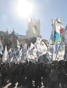 “Queremos convocar a la ciudadanía a esta causa nacional. Es fundamental que nuestro pueblo se concientice sobre lo que está en juego”, agregó luego el dirigente de la agrupación juvenil kirchnerista. De fondo, centenares de militantes enarbolaban sus banderas y lanzaban sus característicos cánticos en la carpa blanca que se levantó en el patio del Cabildo, mientras afuera la Juventud Peronista se plegaba al repudio con un gran despliegue de paraguas celestes y blancos.