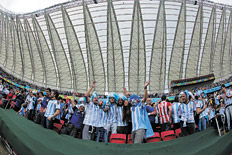 La invasión argentina en Porto Alegre fue realmente impresionante. No fueron los 200 mil estimados por los gobiernos de ambos países, pero sí un poco más de la mitad, y por supuesto más del doble de los que tenían entradas para el partido. Desde bien temprano a la mañana, la avenida Borges de Medeiros estaba repleta de camisetas argentinas, de hinchas dispuestos a caminar los más de dos kilómetros que separan el centro de la ciudad, donde se encuentra el antiguo mercado El Brique da Redencao –lugar de encuentro de los Gaúchos–, hasta el renovado estadio Arena Beira Río, con su fachada moderna y imponente.