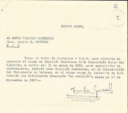 “En todas sus declaraciones, Grasselli omitió esta información y es relevante mencionarlo porque un capellán castrense es funcionario público”, señala un informe de la Comisión Provincial por la Memoria (CPM) elaborado a pedido de la Procuraduría de Crímenes contra la Humanidad y parte del análisis de Delgado. “El vicariato castrense es una institución de doble pertenencia que responde a la Santa Sede en el orden religioso-doctrinario y al Estado nacional en el orden político-militar-económico, por lo que sus miembros son tanto miembros del clero como del aparato estatal, del cual perciben una remuneración mensual y un conjunto de obligaciones.”