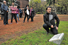 Ernesto Lejderman Avalos observa la placa en homenaje a su padre, Bernardo Mario Lejderman, que se colocó ayer en la Plaza República de Chile de la ciudad de Buenos Aires. El acto se realizó en memoria del militante de izquierda argentino Lejderman, quien se exilió en Chile durante la dictadura de Onganía, militó en la Unidad Popular y fue asesinado junto a su mujer, María del Rosario Avalos Castañeda, el 8 de diciembre de 1973. Participaron del homenaje la legisladora del Frente para la Victoria Gabriela Alegre –autora de la iniciativa–, el embajador de Chile en Argentina, Marcelo Díaz, y representantes de organismos de Derechos Humanos de Argentina y Chile, entre ellos, Alicia Lira Matus, presidenta de la Agrupación de Familiares y Ejecutados Políticos.