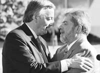 - Tras la primera vuelta electoral de las elecciones presidenciales, Kirchner viajó a Brasilia (fue la primera vez que pisó Brasil) para reunirse con Lula. Había declamado en su campaña que la relación con Brasil sería de alianza estratégica, de socio y compañero político para, además de revitalizar el alicaído Mercosur, enfrentar a los poderosos de la tierra en condiciones menos desventajosas.