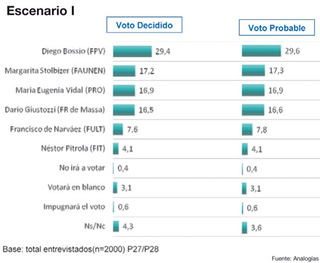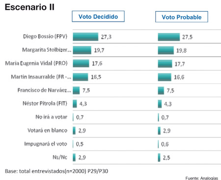Pero, si Insaurralde se pasa al FR y compite con Bossio como candidato del FpV, perdería no sólo con el titular de la Anses, sino también con la candidata de FA-Unen, Margarita Stolbizer, y con María Eugenia Vidal, del PRO. Así lo consigna el cuadro respectivo de la encuesta de Analogías.