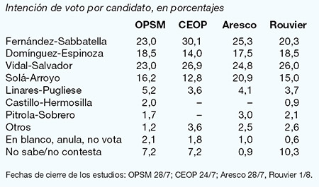 “Respecto de la elección a gobernador –completa Rouvier–, nosotros seguimos teniendo dentro del FpV a Aníbal en primer lugar, pero Julián Domínguez ha mejorado sustancialmente su posicionamiento, logrando ubicarse muy cerca del primero, con un diez por ciento de indecisos. Es importante aclarar que en el territorio hay una verdadera guerra de boletas que la militancia y los intendentes enarbolan en su trabajo político-electoral; y que dificulta en mucho una medición certera sobre lo que ocurre. Domínguez comenzó muy abajo por el desconocimiento existente y la carencia de información de los electores inclusive en los municipios de clara influencia de su candidato a vice: Espinoza. La base progresista no peronista se divide entre las dos listas; pero, por peso numérico, esta elección se define en el espacio más peronista del territorio. Sobre la incidencia de los intendentes, muchos de los cuales apoyan a Domínguez, en el tramo final a las PASO se construyen teorías o mitos, que en realidad finalmente se develarán cuando el escrutinio termine su tarea. Al dividirse los votos del peronismo/kirchnerismo, la candidata a gobernadora por el PRO, María Eugenia Vidal, aparece en el tope de las preferencias, con la tracción que produce el cabeza de lista: Macri. El ex gobernador Solá que tiene un buen posicionamiento en su territorio, supera levemente en votos a la sumatoria de Massa y De la Sota, pero el límite a su crecimiento proviene del mismo Frente Renovador, que no logra ponerlo en las primeras posiciones. En la izquierda sobresale la candidatura del binomio Pitrola-Sobrero, hasta el momento, con valores pequeños.”