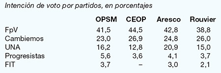 Por partido, el FpV supera por un promedio de 17 puntos a Cambiemos y por 24 a UNA. La divergencia de medidas en la interna oficialista, con diferencias de dos a 16 puntos.
