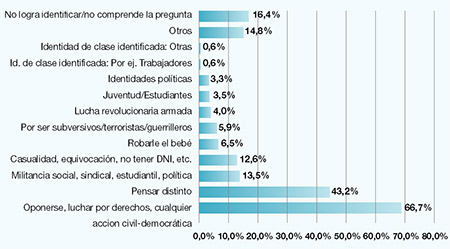 En segundo lugar (43,2), casi literalmente, aparece el hecho de “pensar distinto” como causa del secuestro y la desaparición en manos del Estado. “Para ellos ‘el pensar’ es también un lugar de la acción, individual, contestataria y molesta al poder”, advierten. Más allá de la diferenciación entre “pensar” y “hacer”, es clara la distancia con “las representaciones típicas de los dos demonios” con su consecuente criminalización generalizada de las víctimas. En tercer lugar (28 por ciento) aparecen las “militancias e identidades específicas”, con respuestas como revolucionarios, montoneros, peronistas, ERP, trabajadores o dirigentes gremiales. Detrás (12,6) figuran las respuestas referidas a “víctimas inocentes”, como “estar en una agenda”. (Ver gráfico 2)