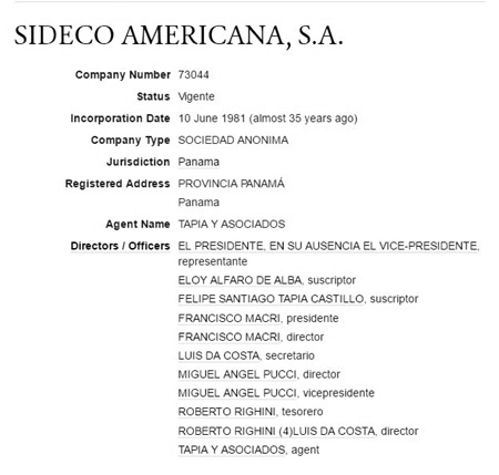 La sociedad offshore Sideco fue inscripta en Panamá el 10 de junio de 1981 y la nómina de sus integrantes coincide con los principales hombres de confianza de Franco Macri. De acuerdo con el registro público de Panamá, como presidente y director de la firma offshore figura el propio Macri padre. Como vicepresidente aparece Miguel Angel Pucci, quien era director de Sevel cuando Franco y Mauricio fueron procesados por contrabando, en el año 2000. Como tesorero figura Roberto Ringhini, el hombre que el Grupo Macri puso en la Comisión Vial del Ministerio de Obras y Servicios Públicos, en los años del menemismo, cuando la familia fue beneficiada con concesiones de rutas nacionales. Y como secretario aparece Luis Da Costa, ex directivo de Sevel, también procesado en aquella causa por “contrabando agravado”. Según el mismo registro oficial, uno de los agentes que conformó la empresa offshore fue Eloy Alfaro de Alba, quien fue embajador panameño en los Estados Unidos. Otro integrante, Felipe Santiago Tapia Castillo, es un nombre poco original en los registros del paraíso fiscal: ocupa diferentes puestos como en un millar de empresas.