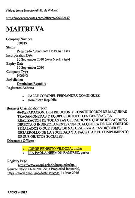 A nombre de Ricardo Miguel Cavallo existe una sociedad offshore registrada en Orlando, Florida, Estados Unidos. Según el sitio de open data denominado opencorporates.com la compañía se llama Mari USA LLC y figura actualmente activa. El agente es Larson Accounting & Consulting Service LLC. A nombre de un Jorge E. Acosta, nombre del jefe del Grupo de Tareas de la ESMA, figuran ocho sociedades en distintos lugares de Estados Unidos: Florida, California, Michigan, Connecticut y Michigan. A nombre del hijo de Jorge Vildoza, segundo del GT de la ESMA, llamado Jorge Ernesto Vildoza y también ex marino, existe una sociedad de nombre Maitreya SA, con domicilio en República Dominicana, registrada el 30 de septiembre de 2010 y dedicada al negocio de las máquinas tragamonedas de los casinos.