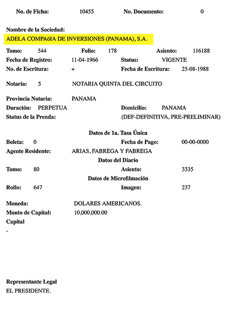 Como su nombre lo indica, el Registro Público de Panamá, que tan famoso se hizo desde el estallido de los Panama Papers, es de acceso público. Allí aparece una sociedad muy simbólica en términos históricos y poco conocida en estas causas. Su nombre es Adela Compañía de Inversiones SA, un consorcio creado por capitales norteamericanos en 1966 para inyectar dinero en América Latina en el marco de la Guerra Fría. Según el registro panameño, Adela tiene duración “perpetua” y está “activa” con un capital declarado curiosamente importante: 10.000.000,00 dólares, un número poco frecuente en los archivos de otras sociedades offshore de ese país que muestran usualmente cifras de 1.000 dólares. El “presidente” de la compañía, de acuerdo a ese registro, es Miguel Angel Egea, que a la vez aparece como su “representante”. En el directorio están Norma Beatriz Radice y otros nombres asociados a ellos en otras empresas de Buenos Aires como Darío Jesús Orozco Acuña.