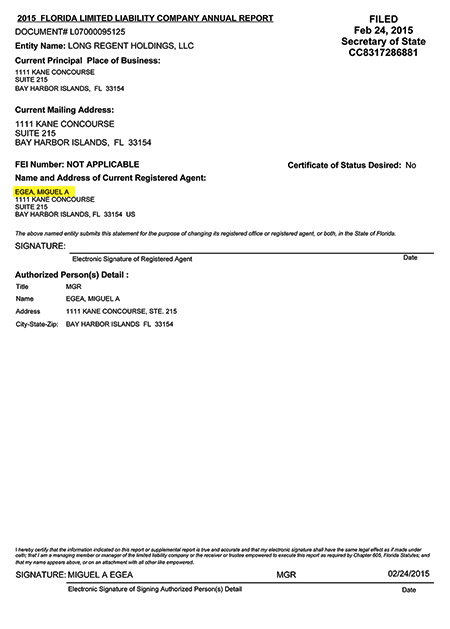 - Long Regent Holdings, LLC, radicada en Bay Harbor Island de Miami, creada el 18 de septiembre de 2007 y aun activa. Integrada por Egea.