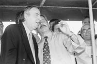 Junto a Kirchner habían llegado los ministros Aníbal Fernández (Interior), Julio De Vido (Planificación) y Alicia Kirchner (Desarrollo Social). También estaba el gobernador bonaerense, Felipe Solá, y dos de sus ministros. El intendente anfitrión, Alberto Balestrini, presentó a Kirchner y Solá como si fuera un animador. “Son dos hombres que están cambiando el país al lado de los desposeídos y los desocupados”, los elogió Balestrini. Hace un mes, el intendente denunció que el Gobierno había suspendido cinco mil subsidios de su municipio. “Va a tronar el escarmiento”, había dicho entonces. Aquel episodio, que generó una dura respuesta del jefe de Gabinete, Alberto Fernández, pareció quedar zanjado ayer. Aunque en el Gobierno tuvieron que esforzarse para que Balestrini compartiera un palco con D’Elía, con quien está distanciado.