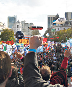 Los inmensos carteles con los rostros de las vedettes tienen competencia esta tarde. En el medio de la calle Corrientes, un actor caracterizado como San Martín se traslada por la avenida en un carro de recolección de residuos. “Meritocracia”, “Dependencia”, “Pobreza”, “Ajuste”, “Hambre”, “Olvido”, “Represión”, “Desigualdad”, se lee en cada una de las bolsas de basura. Es una puesta teatral, sí, pero también es un reflejo de un sentir colectivo, de un reclamo. El actor y el carro no están solos en la escena. Lo acompaña una columna rica y diversa de manifestantes nucleados en el Frente de Artistas y Trabajadores de las Culturas y otros colectivos como Cultura Unida, el grupo Catalinas Sur. El grupo de artistas se concentró en la puerta del Teatro San Martín y se reunió en Plaza de Mayo con el resto de las organizaciones sociales que participaron ayer de la marcha federal para ponerle un freno a las políticas macristas de ajuste, despedidos y tarifazo.