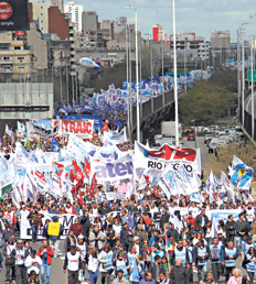 Roberto Baradel, dirigente docente bonaerense y secretario general de la CTA de esa provincia, fue el último en hablar antes de la que la marcha enfilara para el puente Pueyrredón. Antes lo hicieron Pedro Wasiejko, el intendente de Ensenada, Mario Secco, y Cristian Miño, de la CNCT. Baradel recordó los doce años de gobiernos kirchneristas. “No fueron en vano, pero para que gobiernos así fueran posibles tuvo que haber organizaciones y trabajadores que resistieron dictaduras y neoliberalismo como estamos resistiendo ahora”, explicó. “El pueblo unido jamás será vencido”, remató. Los manifestantes le pusieron melodía y aplausos a ésa y a otras consignas, como “pueblo que lucha, gobierno que no escucha” o “Macri basura vos sos la dictadura”.