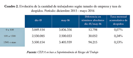 Los últimos datos disponibles son del período que va desde diciembre de 2015 y mayo de este año. A ellos se remite el CEPA y de su análisis surge que las empresas del segmento más pequeño, con menos de 100 trabajadores, han mantenido sus plantillas sin mayores modificaciones hasta abril. La contracara son las compañías con más de 1.500 empleados, que redujeron sus planteles laborales de manera ininterrumpida, con una caída del empleo de 2,69 por ciento durante el período analizado.