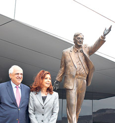 En su primera salida al exterior desde que dejó la Casa Rosada, CFK cumplió su segunda jornada de actividades en Quito reuniéndose con el colombiano Samper, que desde 2014 encabeza la Unasur. La ex presidenta difundió varias fotos del encuentro, algunas junto a la estatua dorada de Kirchner en la entrada al moderno edificio en las afueras de Quito. En la biblioteca del organismo, que lleva el nombre de Gabriel García Márquez, le dejó una dedicatoria al fallecido escritor colombiano. “Para Gabo, que estaría feliz por su Colombia y La Paz, por fin... Cristina Fernández de Kirchner”, escribió, en referencia al acuerdo del Estado colombiano con las FARC.