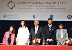 La gobernadora bonaerense María Eugenia Vidal y el titular de la Corte Suprema, Ricardo Lorenzetti, inauguraron la VII Conferencia Nacional de Jueces que se extenderá hasta hoy, en la ciudad de La Plata. “Así como dijimos una vez nunca más al terrorismo de Estado, también tenemos que decir nunca más a la violencia de género, a la pobreza, a la corrupción, al narcotráfico”, señaló el ministro de la Corte en su discurso ante unos 600 magistrados reunidos en el Teatro Coliseo Podestá.