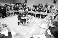 Inquieto y nervioso, hablando rápido hasta quedarse casi sin aire, el cortesano jugó una de sus últimas cartas. Vázquez, el más menemista de todos de sus ex colegas, terminó su descargo asegurando que los procesos contra los miembros de la Corte –ordenados “por el Presidente por cadena nacional”– han logrado detener la tarea del máximo tribunal. Reconoció que se siente molesto y perturbado en su trabajo, pero al mismo tiempo juró resistir las presiones. Cada frase, cada afirmación eran acompañadas por el asentimiento de sus seguidores, entre los que se sumó casi al final el actor y ahorrista Nito Artaza.