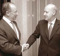 - Encuentro y reencuentro: Lavagna conoce a Rato desde hace años, tuvieron alguna reuniones mano a mano, incluido alguna tenida muy dura referida a las privatizadas. Se tutean, algo no tan inusual para las costumbres españolas y argentinas. Kirchner lo veía de cerca por primera vez. Rato no se privó de una ironía al destacarle que Lavagna le hablaba siempre bien de él (ver nota central). El cónclave en la Rosada fue más breve que el de Economía, menos técnico y se centró en lo que el Gobierno tabula como esencial: presupuesto, deuda con bonistas y privatizadas. Ambos encuentros, descriptos por los argentinos, fueron como a ellos les gustan: francos, duros. Pero mucho más cordiales que alguna célebre reunión de Kirchner con Horst Köhler, el antecesor de Rato.