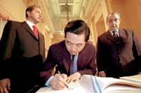 En la bandeja de autoridades fue notoria la ausencia de miembros del Ejecutivo. Hubo sólo dos gobernadores: el sanjuanino José Luis Gioja y el chubutense Mario Das Neves. Se vio al jefe del Ejército, Roberto Bendini, y al de la Armada, Jorge Godoy. Con paciencia todos esperaron que concluyera la recepción que Scioli le brindó al mandatario chino en el Salón Eva Perón. Algo que no suele realizarse precisamente por la descortesía que significa dejar a los parlamentarios esperando. Además de que la Asamblea Legislativa es por su naturaleza el órgano más importante del Congreso.