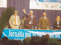 La Jornada había comenzado a primera hora de la mañana. Habían hablado el ministro de Planificación, Julio De Vido, el piquetero Luis D’Elía, el titular de la CGE, Marcelo Fernández, y Bernardo Kliksberg, asesor de Naciones Unidas y la Unesco. Pero el plato fuerte era la presencia de Kirchner. “Yo sé que a algunos les molestan algunas cosas. Prefieren verme de cóctel en cóctel en lugar de venirme a abrazar con ustedes”, comenzó el Presidente, luego de saludar y escuchar durante varios minutos los cánticos de la gente.