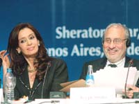 La de la tarde fue la mesa más política, dada la presencia de Cristina Kirchner y del jefe de Gabinete, Alberto Fernández. La completaban el economista Roberto Frenkel y el secretario general adjunto de la ONU, José Antonio Ocampo, mientras que el moderador fue el director de Télam, Martín Granovsky. El cierre quedó para el premio Nobel, que no podía extenderse en su ponencia más allá de las 18: tenía que salir para Ezeiza para subirse al avión que lo trasladaría a Seattle para una nueva conferencia. Pero por el mal tiempo no pudo utilizar el helicóptero que le habían puesto a su disposición, fue en remise y perdió el vuelo.