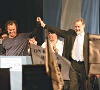 “Nos dice la señora Carrió que somos autoritarios, que somos personalistas. El personalismo está en el ARI, que expulsó a Timerman, a Nun, a tantos otros”, acusó. También se ocupó de Macri y recordó que el grupo que encabeza su padre adeuda mucho dinero al Estado. “En la constitución del señor Macri hay un solo derecho, el de propiedad. Por eso se llama Pro su partido. Para él lo más importante es el derecho a sus bienes, no el derecho a la salud, a la educación”, atizó, haciendo un juego de palabras con el nombre de la alianza de Macri y Ricardo López Murphy. Fiel a su estilo, Bielsa no se olvidó de sorprender a la audiencia con alguna cita. “Hoy cualquier cacatúa sueña con la pinta de Carlos Gardel”, dijo. Fue un recurso para elogiar la “determinación” de Kirchner en la quita de 70 mil millones de dólares, algo que según Bielsa ni Macri ni Carrió se hubieran animado a llevar adelante. En mangas de camisa y transpirando, Kirchner cerró el acto con su discurso más largo de la campaña. “Ya no saben cómo atacarme, atacan a mi familia, truchan la foto de mi pibe”, se quejó, en referencia a una nota de un semanario que publicó equivocadamente la foto de otra persona en lugar de la del hijo mayor de Kirchner.