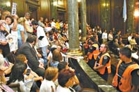 A esa hora estaban ya en la Legislatura los padres que habían pasado toda la noche de vigilia en la puerta y otros que empezaban a llegar para seguir de cerca de las alternativas de la sesión de la Sala Acusadora. Aunque se había dicho que sólo entraría el recinto un pequeño grupo y que los demás serían acomodados en un salón contiguo, finalmente fueron muchos más lo que ingresaron y se hicieron sentir en todo momento, pero sobre todo cada vez que habló algún legislador a favor de Ibarra: no sólo repitieron una y otra vez “los chicos presentes/ahora y siempre”, sino que además cantaron contra Ibarra y contra todos aquellos que se oponían al juicio político.