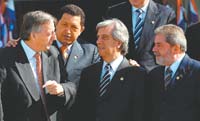 De a poco, la relación que armaron Kirchner y Chávez va tomando peso específico dentro del continente. El presidente argentino necesita de la ayuda energética y de la económica que el venezolano le facilita a través de la compra de bonos de la deuda, millones frescos que le permiten esperar con menos urgencias la reapertura de las negociaciones con el FMI. Chávez, por su parte, precisa no verse aislado dentro de la región, una necesidad que tiene tanto de político como de institucional. Mucho mejor si puede mostrarse rodeado de presidentes “amigos” como Kirchner y Lula, los dos países de mayor potencial a nivel subcontinental. El presidente argentino le dio una mano en su discurso en la cumbre al felicitarlo especialmente “por el legítimo triunfo electoral que ha obtenido”. En las recientes elecciones legislativas en Venezuela la oposición decidió no presentarse y se registró un bajo nivel de participación.