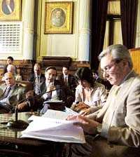 El chubutense Marcelo Guinle, hasta febrero presidente provisional del Senado, vicepresidente de Asuntos Constitucionales, titular a partir de hoy de la estratégica Comisión de Acuerdos, presentó el tema a los nuevos senadores y luego del pantallazo abogó por que no se reabriera la discusión. Una propuesta que avaló Pichetto y que el titular de la bancada radical, Ernesto Sanz, consintió pese a que marcó las diferencias con la propuesta del oficialismo. El radical mendocino presentó un proyecto en minoría y dijo que muchos de los opositores a la iniciativa no habían sido escuchados, como los miembros del Consejo, pese a que lo pidieron. “Algo leí en los diarios”, respondió Guinle.