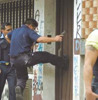 Lo cierto es que varios patrulleros persiguieron a los delincuentes, hubo un primer enfrentamiento en Catamarca y Paraná, frente a la Villa La Rana. Los policías no alcanzaron a responder y allí cayó muerto el oficial de la comisaría octava de San Martín, Gustavo Adrián Farías, de 36 años, padrede cinco hijos. Según parece, Farías tenía puesto el chaleco antibalas pero al dispararle con fusil, el proyectil le atravesó el chaleco. El teniente Domingo Quintana, de 55 años, quedó herido. De entrada se habló de muerte cerebral, pero al anochecer la información indicaba que las heridas no eran de tal gravedad y que evolucionaba en forma favorable.