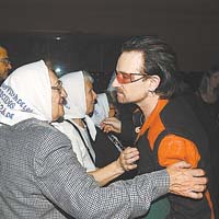 Tras su reencuentro del jueves con Bono, la Asociación Madres de Plaza de Mayo que lidera Hebe de Bonafini sumó las fotos con el cantante de U2 al hall de visitantes de la universidad. Mientras posaba, Bono abrazó a Juanita, una de las madres de 92 años. “¡Oh, my god!”, dijo el cantante al enterarse de la edad. También recordaron cuando el cantante las llevó al escenario en su primer recital en la Argentina. “Vamos a volver a verlas con más tiempo”, prometió Bono.