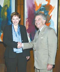 Lehtomäki llegó a Uruguay con una agenda apretadísima, que incluyó algunos seminarios con empresarios y encuentros con casi la mitad del gabinete de Vázquez. El primero en recibirla fue el secretario de la Presidencia, Gonzalo Fernández. Tabaré no pudo asistir a la cita ya que por esas horas viajaba a México (ver página 2). Aunque no hubo ninguna confirmación oficial, la recorrida también habría incluido una reunión con los directivos de Botnia. Justamente la situación que enfrenta la inversión finlandesa fue el eje de su viaje que, convocado hace un año, enfrentó un panorama mucho más complicado que el que seguramente se preveía en ese entonces.