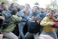 Maltratada y desfigurada, la cara de Nicolás Marrero estuvo ayer en la tapa de unos cuantos diarios, incluido éste: se trata del estudiante que el martes resultó herido por los golpes no docentes. Tiene 23 años, estudia en Ciencias Económicas y milita en el PO. Al ser dado de alta por el Hospital de Clínicas, ayer, tenía aún el ojo izquierdo con un gran hematoma y la boca inflamada. “Responsabilizo a (Atilio) Alterini, a (Jorge) Anró (titular de Apuba) y a Franja Morada porque son los responsables políticos de esta situación”, dijo. Al mediodía, la FUBA presentó una denuncia judicial por las agresiones sufridas. La presentación cita explícitamente la participación en la golpiza de Marcos Prol, adjunto de Apuba, y Sergio Cabral, delegado de Psicología, entre otros dirigentes gremiales retratados en varias de las imágenes tomadas por la prensa durante la trifulca. De hecho, el rectorado abriría sumarios contra los no docentes y los alumnos implicados.